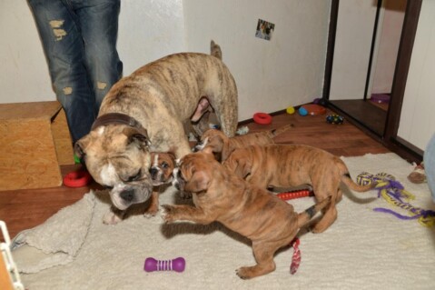Continental Bulldogs Seeblickbulls CHARLOTTE & FRAUKE mit den G-Babys - von hinten schwer erkennbar - am ehesten OSKAR und GUSTAV